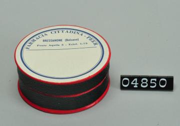 Runde Schachtel aus Karton mit Stülpdeckel. Seitlich schwarzer Glanzpapierbezug mit roten Rändern. Einfarbig blau bedrucktes rundes, den Deckel ausfüllendes Firmenetikett der Farmacia Cittadina Peer Bressanone (Bolzano) Tel 1-73