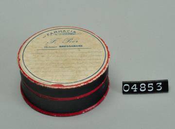 Runde Schachtel aus Karton mit Stülpdeckel. Seitlich schwarzer Glanzpapierbezug mit roten Rändern. Einfarbig blau bedrucktes rundes, liniertes, den Deckel ausfüllendes Firmenetikett der Farmacia F. Peer (Bolzano) Bressanone