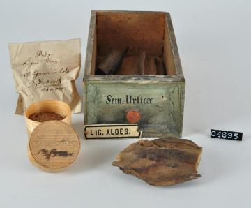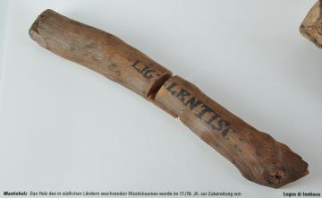 Das Holz des in südlichen Ländern wachsenden Mastixbaumes wurde im 17./18. Jh. zur Zubereitung von Abkochungen bei Gebärmuttervorfall und als Wasser treibendes Mittel eingesetzt. Schon Anfang des 19. Jh. war es nicht mehr aktuell. Das direkt beschriftete Holz verweist auf die Ganzdroge als übliche Handelsform, die markiert und unverwechselbar auf den Weg geschickt wurde. Die groben Bearbeitungsspuren an der Spitze des zweiten Holzes spiegeln die Arbeit in der Apotheke wider, wo die Ganzdroge mühsam zerkleinert werden musste.
