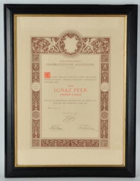 Das Executiv-Comitè der ersten Internationalen Pharmazeutischen Ausstellung in Wien 1883 bedankt sich bei Iganz Peer I, Apotheker in Brixen, für die Beteiligung an der Ausstellung.