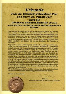 Urkunde zur Verleihung der Johannes Valentin Medaille in Bronze. Verliehen von der Deutschen Gesellschaft für Geschichte der Pharmazie. Gerahmt.