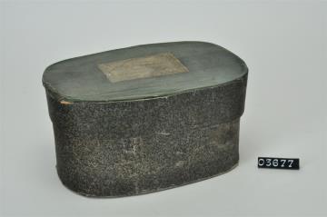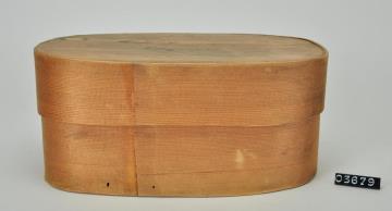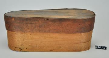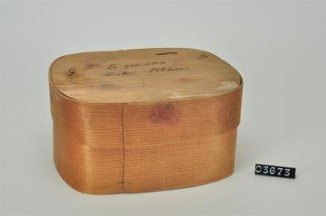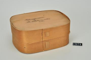 Ovale Spanschachtel. Stülpdeckel aus Span. Deckel wahrscheinlich von anderer, unbekannter Spanschachtel. Mit Signatur.