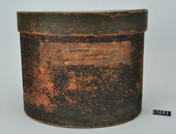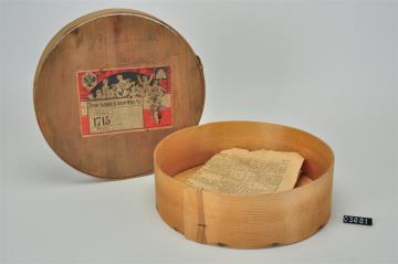 Runde Spanschachtel mit Stülpdeckel. Ursprünglich Versandschachtel der Firma Victor Schmidt & Söhne, Wien. Innenliegend Seite drei und vier des "Tiroler Tagblatt" Nr. 198 aus dem Jahre 1895.
