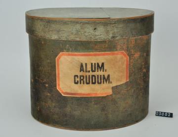 Runde, zylinderförmige grün bemalte Spanschachtel mit Stülpdeckel. Rot umrandetes Schild, schwarz signiert.