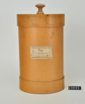 Zylinderförmige Dose aus Hartpapier, Stülpdeckel aus Holz mit zentralem Knauf und Hartpapierrand, braun lackiert. Signiert.