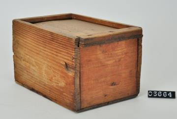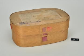 Rechteckige Spanschachtel mit abgerundeten Ecken. Stülpdeckel aus Span. Adressiert und mit Signatur.