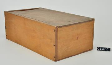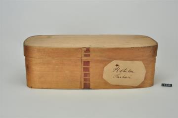Rechteckige Spanschachtel mit abgerundeten Ecken. Stülpdeckel aus Span. Adressiert.