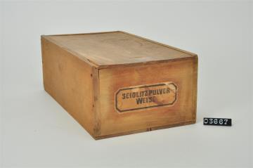 Quaderförmige Holzschachtel mit Holzschiebedeckel. An allen vier Seitenteilen signiert. Drei davon handschriftlich. Ohne Inhalt.