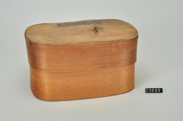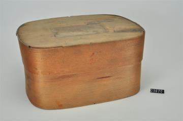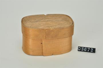Rechteckige Spanschachtel mit abgerundeten Ecken. Stülpdeckel aus Span. Signiert.