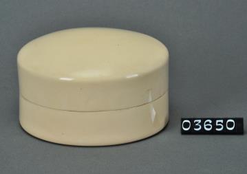 Runde, beigefarbene, zylindrische Dose aus Bakelit mit nach außen gewölbtem Stülpdeckel. Leicht nach oben gewölbter Boden.