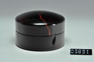 Zylindrische Dose aus Celluloid mit konvexem Stülpdeckel. Leicht nach oben gewölbter Boden.
