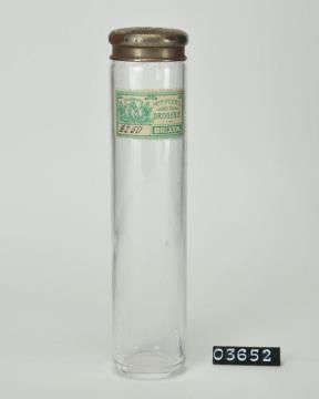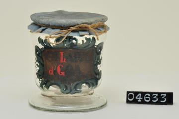 Grünstichiges, zylindrisches Bindeglas mit hochgestochenem Boden und kleinem Hefteisenabriss. Die kugeligen Samen der Pfingstrose heißen im Volksmund auch Zahnkörner oder Hexenkörner und wurden laut den Kräuterbüchern des 16. Jh. im Volksglauben als Halsbänder zum Schutz vor Gespenstern, für zahnende Kinder und „gegen die Gichter“ verwendet.