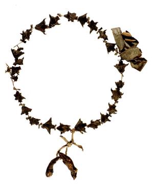 Kette mit 24 Früchten der Wassernuss mit zwei angehängten Tierklauen. Sie wurde als Amulett gegen Epilepsie getragen oder über die Wiegen kleiner Kinder gehängt, um sie vor den gefürchteten Krämpfen zu schützen. Ursprünglich waren die winzigen Schleifen zwischen den Früchten und auch die obere große Masche in kräftigem Rot gehalten, der Symbolfarbe für die Abwehr der Fallsucht.