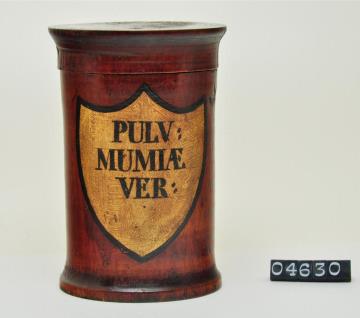 Braune, zylinderförmige Holzdose (Holzbüchse) mit ausgestelltem Standfuß und eingepaßtem, kaum gewölbtem Stülpdeckel und nach außen gebogenem Profil. Auf der Schauseite schildförmiges und goldfarbenes Beschriftungsfeld mit schwarzem Rand. Schwarz signiert. Bis ins 18. Jh. gehörten solche wie Kohle aussehende Stücke zum offiziellen Arzneischatz und wurden in der pharmazeutischen Warenkunde als Teile ägyptischer Mumien beschrieben. Wegen der beim Einbalsamieren verwendeten bitumenhaltigen Harze waren sie als wundheilender Zusatz zu Pflastern geschätzt. In der Zubereitung als Essenz sollten sie das Blut reinigen und verdünnen. Weil echte Mumie selten und teuer war, kamen häufig Fälschungen aus Harz, Knochenresten und Stofffetzen in den Handel. Aus den Leichen von Delinquenten wurde auch „frische“ Mumie hergestellt, sie galt aber nicht als „Arzneibuchqualität“.