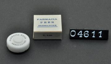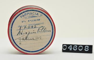 Atropinpillen ca. 100 Stück in runder Kartondose der Farmacia F. Peer (Bolzano) Bressanone. Aus Atropin, Zucker und Arabischem Gummi hergestellte Pillen gegen Schweißausbrüche bei Lungenkranken mit 0.0005mg Wirkstoff pro Pille.