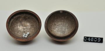 Kugelige Rollierdose aus Holz zum Überziehen der Pillen mit Blattsilber zum Ineinanderstecken. Für wohlhabende Patienten wurden die Pillen versilbert. Dazu ließ man sie in den mit Blattsilber ausgelegten Dosen so lange kreisen, bis sie gleichmäßig überzogen waren. Mit fünf versilberten Pillen und Silberfolie.