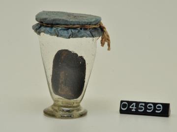 Kleines, becherförmiges Vorratsgefäß aus farblosem Glas mit Fuß. Signiert auf blauer Tektur. Enthält Theriak.