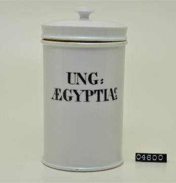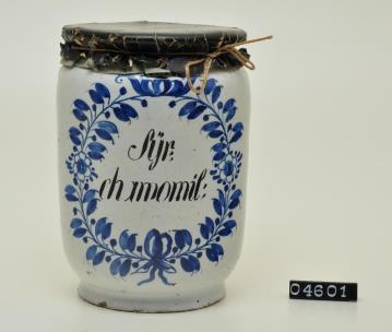 Zylinderförmiges Standgefäß mit abgesetztem Fuß, leicht eingezogenem Hals und Binderand. Standboden kaum aufgewölbt. Ovaler Laubkranz in kobaltblauer Unterglasurmalerei, schwarz signiert und schwarze Tektur. Am Boden Werkstattzeichen. Syrupus Chamomillae: Aus Kamillen, Wasser, Weingeist und Zucker mittels Erwärmen hergestellter ”Kamillensirup” zum Einnehmen bei Magenbeschwerden.