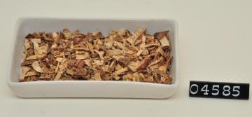 Die in einem Porzellanschälchen gezeigte, geschnittene Droge des Seidelbastes wurde in Wasser eingeweicht und auf die Haut gelegt, und diente als Blasen ziehendes Mittel zur Absonderung von Eiter.