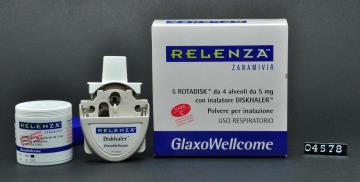 Verschreibungspflichtiges Medikament. Blau-schwarz beschrifteter Faltkarton der Glaxo Wellcome S.p.A. Verona mit Inhalierer und fünf Kapseln zum Inhalieren. Ärztemuster. Pulver-Inhaler: Diese Arzneiform eignet sich besonders für Präparate gegen Asthma. Die Öffnung der Inhalerdose wird mit dem Mund umschlossen, dann der Dosierer betätigt und gleichzeitig fest eingeatmet. Eine Pumpvorrichtung zerstäubt die exakt berechnete Dosis der pulvrigen Arzneistoffe.
