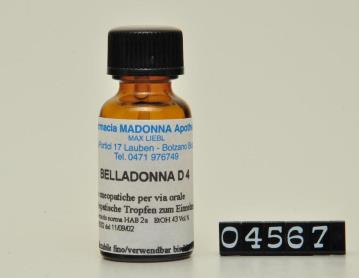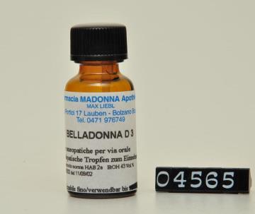 Braune zylindrische Enghalsflasche zu 10ml, mit schwarzem Schraubverschluss aus Kunststoff. Flache Schulter. Hergestellt, etikettiert und abgefüllt von der "Madonna Apotheke Max Liebl, Bozen" im Jahre 2002.