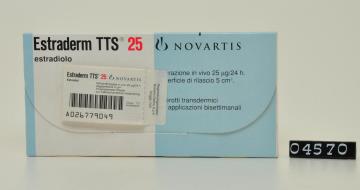 Verschreibungspflichtiges Medikament. Blau bedruckte Schachtel mit 6 Transdermalen Pflastern gegen Wechseljahrbeschwerden der Firma Novartis OTC mit Waschzettel in Deutsch und Italienisch.
