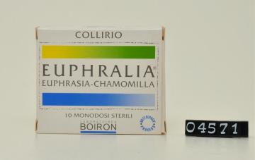 Freiverkäufliches MedikamentFarbig bedruckte Faltschachtel für 10 Augentropgfen in Einmalfläschchen aus Plastik der Firma Laboratories BOIRON S.r.l.