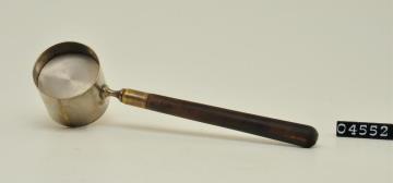 Pfeifenähnliches Gerät: Runder vernickelter Zylinder mit Holzstiel und mittels Schraubgewinde verstellbarer Boden zum Dosieren von Pulvern.