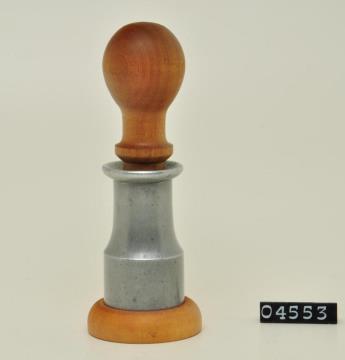 Zur Kaltherstellung von Vaginalkugeln nach Kummer. Stempel und Bodenplatte aus Buchsbaumholz, Mantel aus Zinn. Dazu Kasten aus Holz, Deckel mit Papier überzogen und signiert. Darinnen mit Talcum gefüllte runde Pappdose mit Loch.