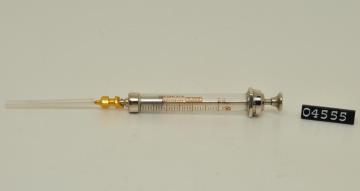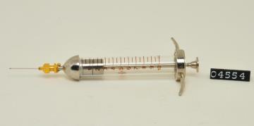 Sterilisierbare Injektionsspritze aus Glas mit Injektionsnadel für 3 ml/cc Lösung. Firmenzeichen: negatives H in ovalem Wappenschild mit zwei ungleichen Türmen.