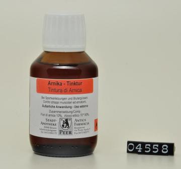 Braune zylindrische Enghalsflasche mit weißem Schraubverschluss aus Kunststoff, innen Kunststoffeinsatz als Tropfenzähler. Hochgezogene Schulter und sich verengender Fuß. Hergestellt, etikettiert und abgefüllt von der Stadtpotheke Peer in Brixen im Jahre 2002. Äußerlich anzuwenden bei Sportverletzugen und bei Blutergüssen. Verkaufspreis für 100ml € 8,45