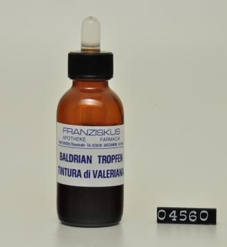 Braune zylindrische Pipettenflasche zu 30ml, mit schwarzem Schraubverschluss aus Kunststoff, mit eingesetztem Tropfenzähler aus Glas mit Plastikpumpe. Hochgezogene Schulter. Hergestellt, etikettiert und abgefüllt von der Franziskus Apotheke in Brixen im Jahre 2002.