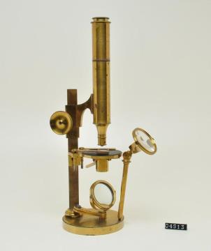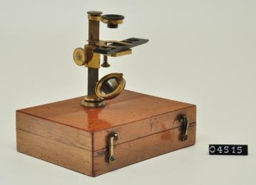 Taschenmikroskop aus Messing mit Holzschatulle. Braun-lackierte Holzschatulle mit Inneneinteilung, ausgeschlagen mit grünem Samt. Auf der Deckeloberseite befindet sich ein Messingplättchen mit Gewinde zum Festschrauben des Mikroskops. Auskunft von Dr. Timo Mappes: Das Instrument wurde eindeutig von Simon Plössl (1794-1868) in Wien um 1845 hergestellt. Auszug aus der Preisliste von 1844: Einfaches Reise- oder Taschenmikroskop mit einem auf dem Deckel des Kästchens aufzuschraubenden Gestelle, einem durch Triebwerk gegen die Linsen zu bewegenden Objecttische mit offener Federklammer, und Drücker zum Öffnen von unten, für Objectträger und Glastafeln aller Art; einem gläsernen concaven Reflexionsspiegel mit doppelter Bewegung, zwei planen une einem concaven Objectenglase; einer Objectnadel mit Pincette zum Aufstecken; zwei Objectschieber mit acht Probeobjecten und eine messigne Pincette.