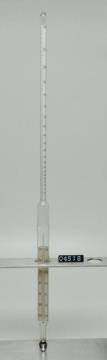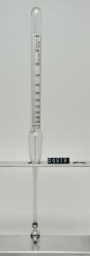 Alkoholometer mit Schutzhülle aus Holz, mit Kappe. Einteilung von 0-100 Vol.% und Thermometer nach Réaumur, geeicht am 12.4.1877. Hersteller: Heinrich Keppler jun. Wien. Zur Dichtebestimmung mit Temperaturangabe. Alkoholometer dienen zur Bestimmung des Alkoholgehalts. Genaue Bestimmung ist nur in einer reinen Alkohol- und Wassermischung möglich. Alkoholometer können aufgrund der physikalischen Eigenschaft (Dichte) messen. Das Alkoholometer misst die Dichte einer Lösung im Vergleich zu Wasser. Alkohol hat eine geringere Dichte als Wasser. Je mehr Alkohol in einer Lösung, desto tiefer in diese Lösung wird daher das Alkoholometer eintauchen. Wo das Alkoholometer versagt, sind Gärmaischen und Liköre.