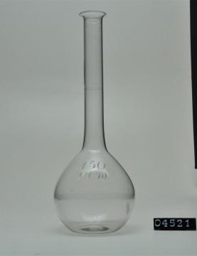 Graduierter Messkolben zu 150 ml aus Glas, mit ganz um den Hals gezogen Eichstrich. Messkolben dienen, wie Vollpipetten und Büretten, als Volumenmessgeräte für Flüssigkeiten im Labor.