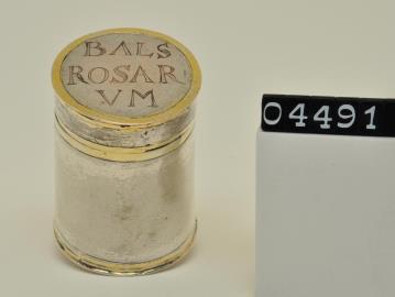 Zylindrisches Gefäß aus Silber mit Schraubverschluss. Oben am Deckel signiert, innen und am äußeren Deckelrand vergoldet.