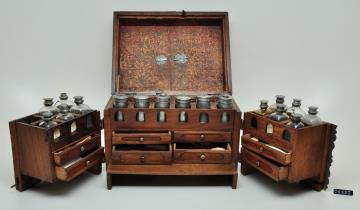 Aufklappbare Reiseapotheke aus Holz mit Zinnbeschlägen, Traggriff, Schloss und Schlüssel, mit 8 Schubladen und 22 Abteilungen. Innen mit grüngoldenem Tapetenpapier ausgeschlagen. Acht runde gefüllte, aber unsignierte Zinndosen mit Schraubdeckel, 12 Vierkant-Glasflaschen mit Zinnverschlüssen, davon sieben teilweise gefüllt und beschriftet. Die Schubladen enthalten historische Arzneimittel, einen Einnahmelöffel und eine Kette mit Gichtkugeln.