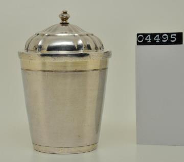 Konische Dose aus Silber mit glockenförmigem Stülpdeckel mit Knauf, innen vergoldet.