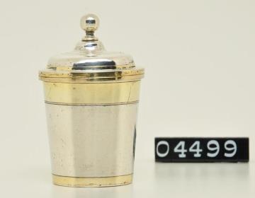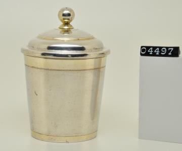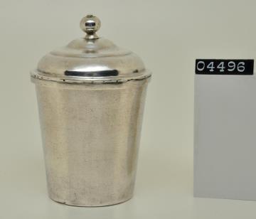 Konische Dose aus Silber mit glockenförmigem Stülpdeckel mit rundem Kugel-Knauf, innen vergoldet. Unterseite mit Meisterzeichen "AJ" oder "IV" und den Initialen "C.Z."