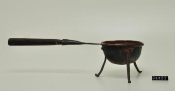 Offene, halbkugelförmige Pfanne aus Kupfer. Dreifüßig zum Aufstellen auf dem Ofen mit offenem Feuer. Angenietete Füße und angenieteter Griff als Rohransatz für Holzstab aus Eisen.