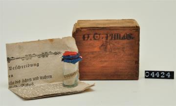 Beschriftetes Holzkästchen mit Schiebedeckel, darin versiegeltes Glasfläschchen und gedruckte Beschreibung. Geheimmittel, das zur Behandlung fast aller Krankheiten angepriesen wurde. Hersteller Samuel Hahnemann, Vertrieb durch Melchior Kaufmann in Augsburg.