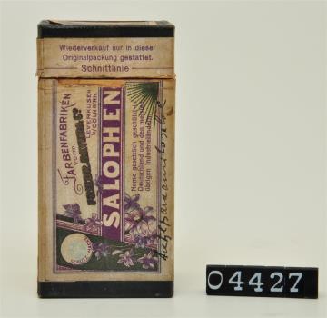 Quadratische Pappschachtel rundum beklebt mit dreisprachigem Etikett. Versiegelung aufgeschnitten. Stülpdeckel mit aufgeklebtem Etikett mit Bayer-Kreuz. Fieber. Schmerz- und Rheumamittel der Farbenfabriken Bayer-Leverkusen. Handschriftlicher Namenszusatz von Ignaz Peer II.