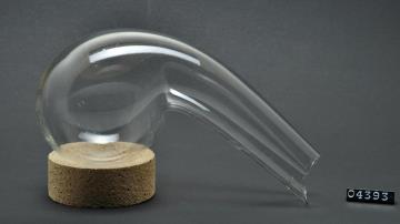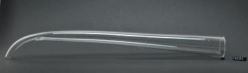 Einseitig gebogenes, sich zur Biegung hin verjüngendes Überleitungsrohr aus farblosem Glas.