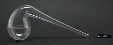 Destilliergefäß: kugelförmiger Körper mit absteigendem Rohrteil (Schnabel). Obere Öffnung (Tülle), hergestellt durch Aufschmelzen eines kleinen Glaspostens und ausziehen desselben. Aufgelegter Faden am Mündungsrand.