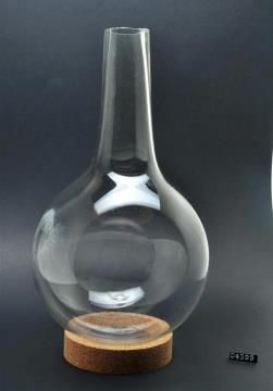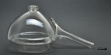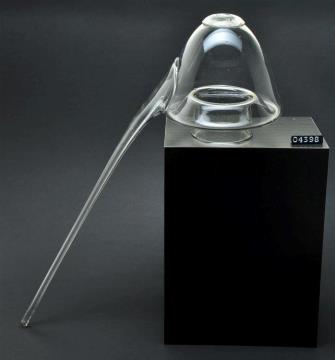 Alambik, Alambique, Alembicus, Destillierhelm, Brennhut, in der Alchemie auch Caput Mauri, Capitellum oder Galea genannt aus farblosem Glas und Einfüllstutzen, hergestellt durch Aufschmelzens eines Glaspostens und ausziehen desselben. Aufgelegter Faden am Mündungsrand. Einfüllstutzen innen geschliffen. Im Alembic kondensierten die aufsteigenden Dämpfe, wurden abgekühlt und liefen über das Ablaufrohr in ein Auffanggefäß (Fürsetzglas).