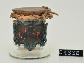 Konisch zulaufendes Bindeglas mit Fuß und ausgebogener Lippe aus farblosem Glas. Signatur in Kaltmalerei, schwarze Buchstaben auf ausgebleichtem Untergrund umgeben von Rankenwerk. Hochgezogener Boden mit Hefteisenabriss und gestauchtem Fuß. Mit brauner Papiertektur, befestigt mit Hanfschnur. Enthält ca 17g Lapis infernalis, Silbernitratpulver.