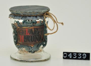 Konisch zulaufendes Bindeglas mit Fuß und ausgebogener Lippe aus farblosem Glas. Signatur in Kaltmalerei, schwarze Buchstaben mit roten Anfangsbuchstaben auf goldfarbenem, teilweise nachgedunkeltem Untergrund umgeben von Rankenwerk. Hochgezogener Boden mit Hefteisenabriss. Mit brauner Papiertektur, befestigt mit Hanfschnur. Enthält Lapis Cancrorum, Krebsstein.