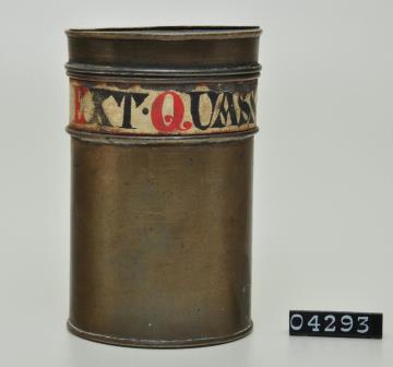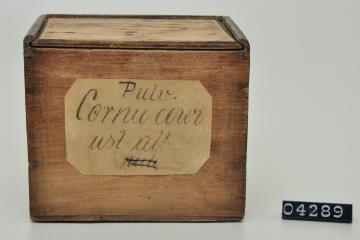 Hellbraune runde, zylindrische gedrechselte Holzbüchse mit Stülpdeckel, innen mit Papier ausgeklebt. Boden leicht ausladend. Lack teilweise abgesplittert. Innen mit schwarz gemustertem blauem Papier ausgeklebt. Boden mit Signatur. Enthält Pulver der Bärlappsporen.