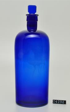Farblose, runde 10 Liter Vorratsflasche mit Korkstopfen und auf der Schulter aufgeschmolzenes Glassiegel. Maschinell hergestellt, manuell nachgearbeiteter Rand. Substanzreste an der Innenwand. Signiert. Enthält Birkenbalsam.