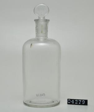Runde, farblose Enghalsflasche mit rundem, flachgriffigem Schliffstopfen und geschliffenem Mündungsrand. Zylindrischer Flaschenkörper mit runder Schulter. Unsigniert.
